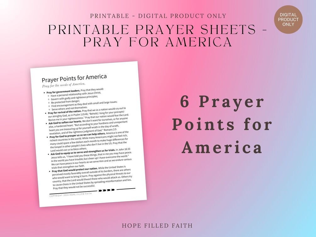 You'll get a 1-page downloadable .PDF file with 6 prayer points to pray for America. No physical item is included.