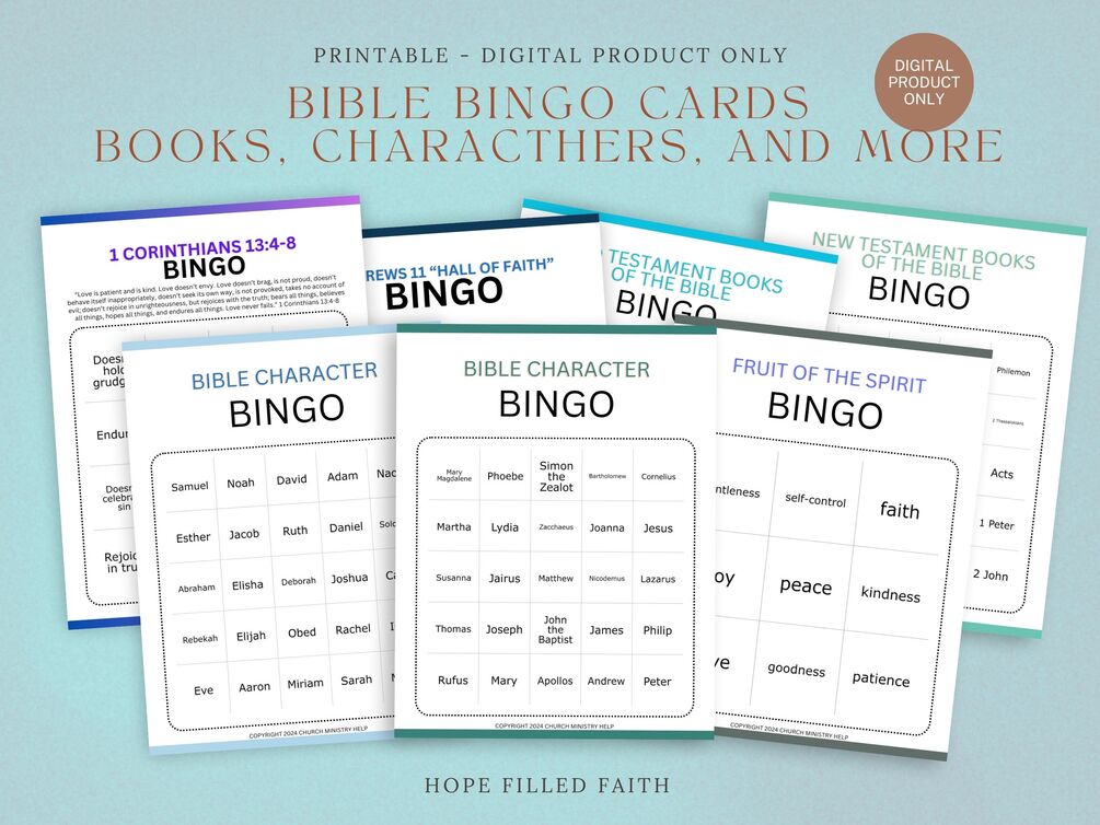 Welcome to our Bible Knowledge Bingo Set Game, where fun and Christian faith come together! This printable game features 50 unique bingo cards on 7 Bible Knowledge topics, perfect for family gatherings, Sunday school classes, or church events.