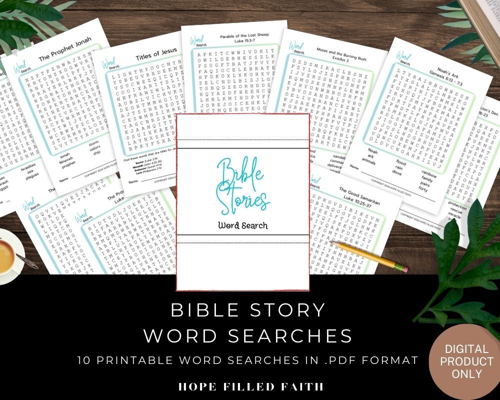 - A 20 page downloadable .pdf with 10 printable Bible Stories Word Searches and the answer keys for the searches.