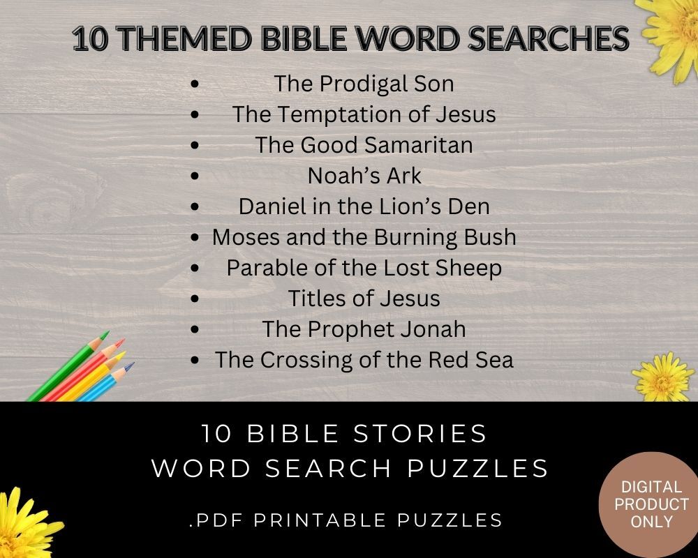 - A 20 page downloadable .pdf with 10 printable Bible Stories Word Searches and the answer keys for the searches. - No physical product will be shipped to you. This is a digital product only.
