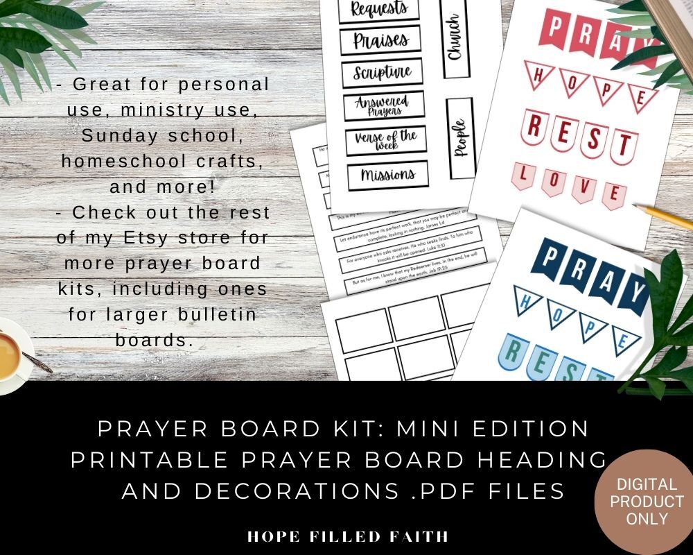 - A 5-page downloadable .PDF file of a prayer board kit printable - No physical product will be shipped to you. This is a digital product only.