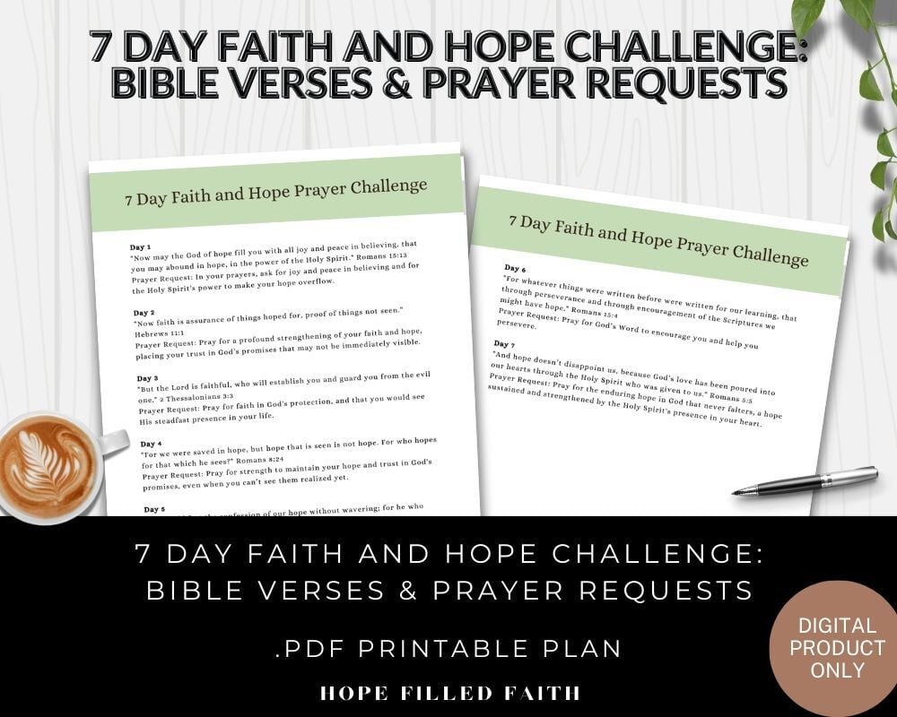 Experience the transformative power of faith and hope with our 7-Day Prayer Challenge for Faith and Hope printable. This free resource is designed to guide you through a week of daily Bible verses and prayer prompts, helping you strengthen your faith and embrace hope in your life.