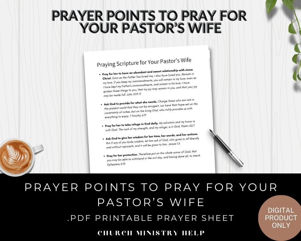 - A 1 page downloadable .PDF file with a list of 5 Bible verses & prayer requests to pray for your pastor's wife - No physical product will be shipped to you. This is a digital product only.